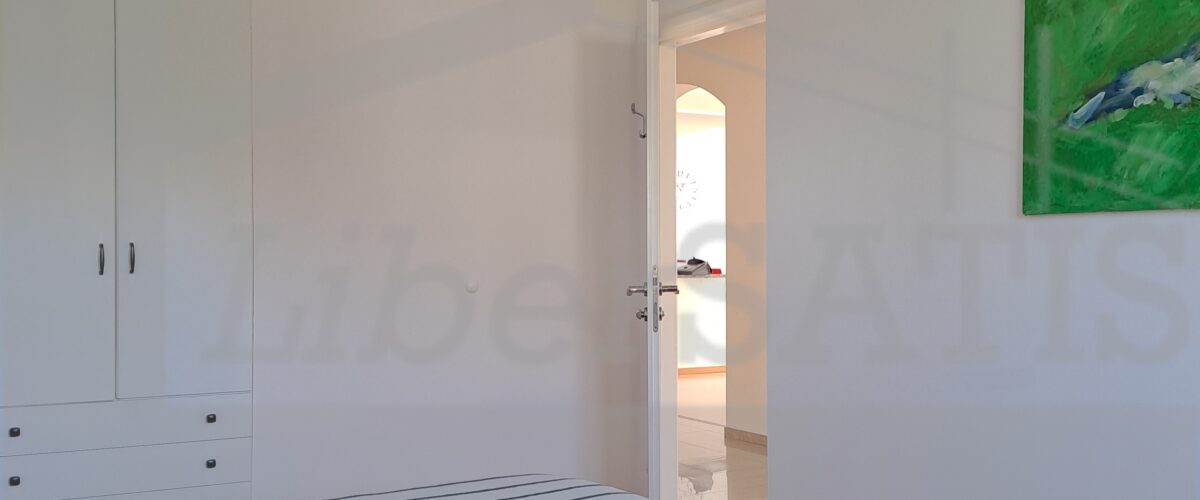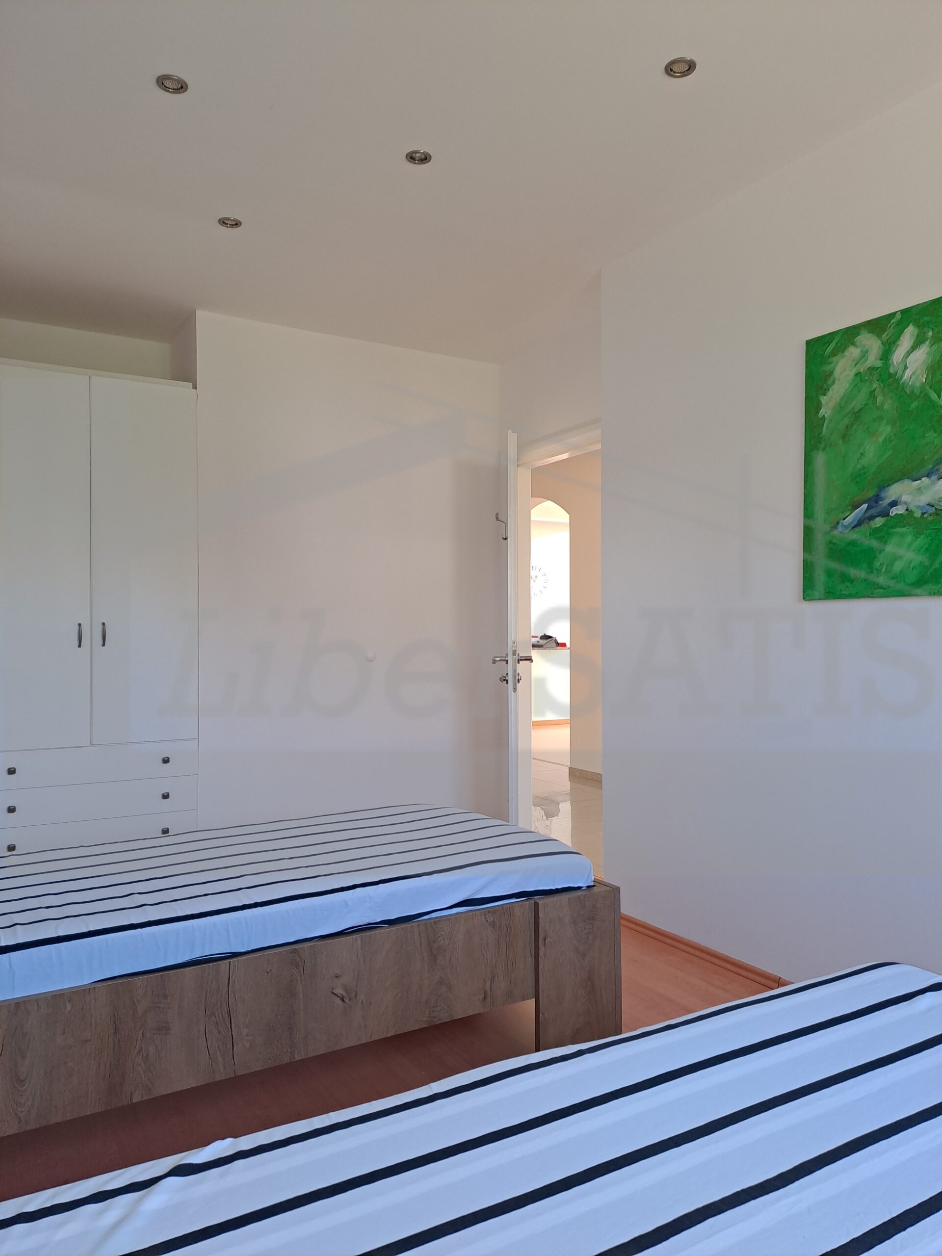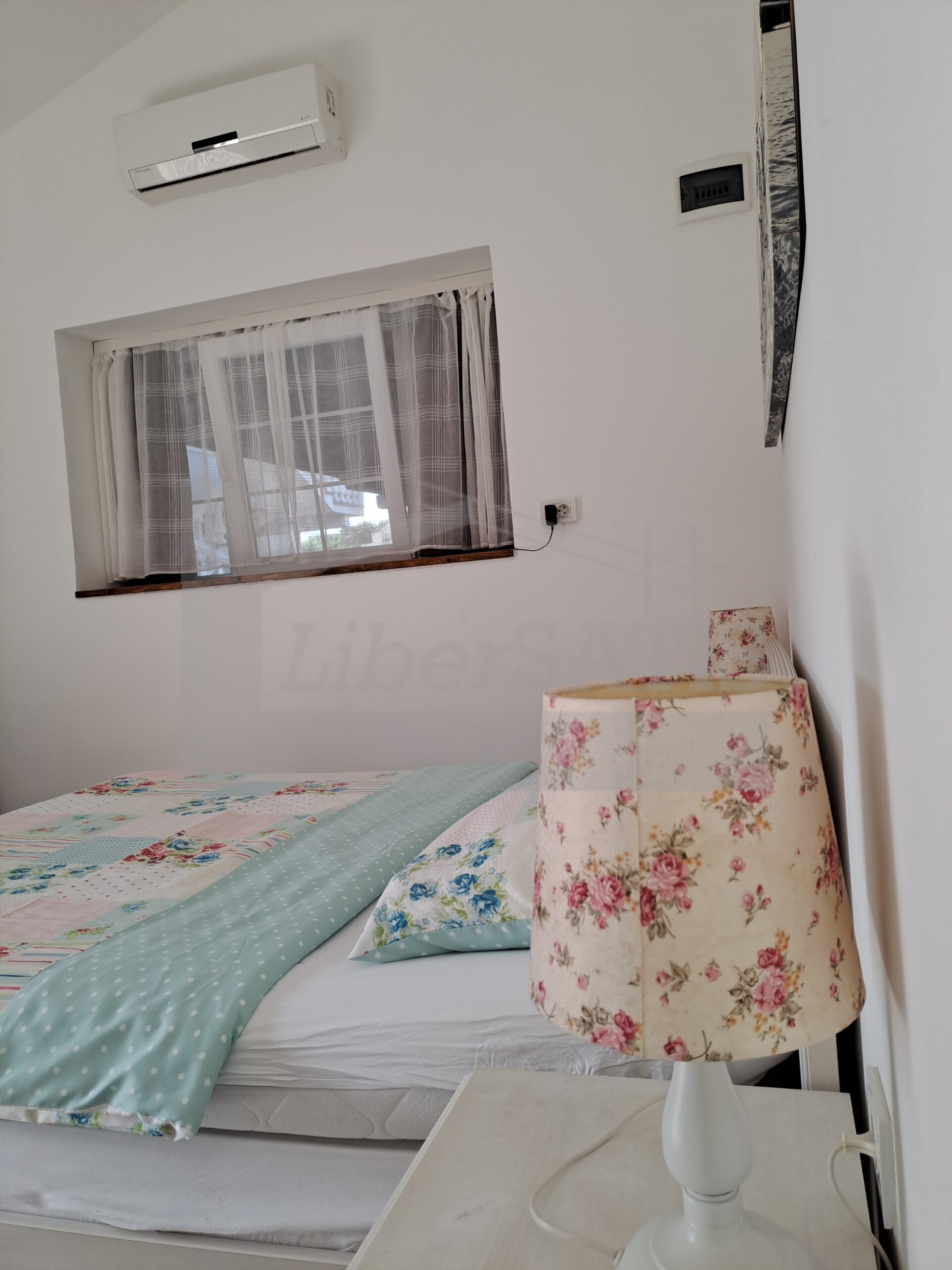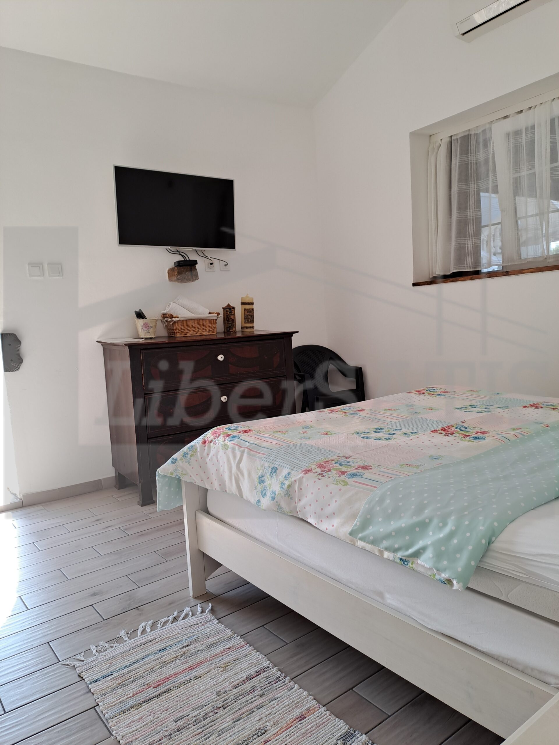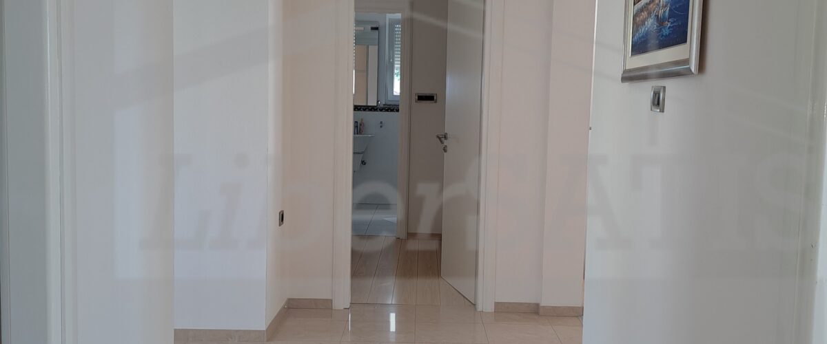 U ponudi imamo po mnogo čemu poseban stan na drugom katu prekrasne vile smještene na parceli veličine 1.100 m2. Sastoji se od hodnika, kuhinje, dnevnog boravka, tri sobe, dvije, kupaonice i terase ukupne površine 128,69 m2, kojem pripada kao sporedni dio ulazna terasa sa stepeništem površine 4,26 m2 i dvorišna zgrada – konoba u okućnici površine 40,52 m2, sveukupne površine 173,47 m2. Stanu pripada i dio okućnice površine 80 m2 kao i dva natkrivena parkirna mjesta. Iza vile, na zajedničkom zemljište, vrlo praktično organizirano je i uređeno mjesto za veća druženja s kaminom-roštiljem. Stan i konoba su klimatizirani, a po potrebi bira se vrsta grijanja, od el. radijatora do vrlo lijepih i funkcionalnih kamina na kruta goriva. Stan je južne orijentacije s prekrasnim pogledom na more udaljeno tek nekih 200-tinjak m do kojeg vodi pješačka staza. Vila je izgrađena 2011 g. te posjeduje energetski certifikat – razred B.