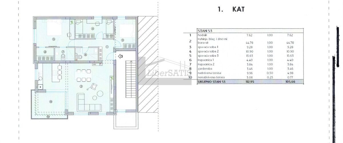 Na 1. katu nalazi se veći trosobni stan. Stan je organiziran s dnevnom zonom i spavaćom zonom. Zona spavaćeg dijela sastoji se od ulaznog prostora, 3 spavaće sobe i kupaonica. Zona dnevnog dijela gdje je smještena kuhinja, blagovaona i dnevni boravak ima izlaz na natkrivenu terasu preko staklenih stijena kako bi se prostoru omogućilo maksimalno prirodno osvjetljenje